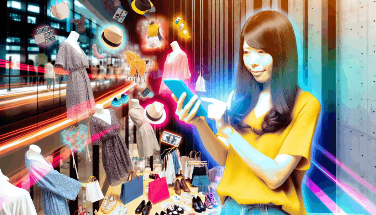 A stylish young Japanese influencer engaged in marketing activities, using a smartphone while surrounded by trendy products, showcasing a vibrant and dynamic urban setting. Bright colors and an energetic atmosphere highlight the essence of influencer culture.