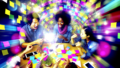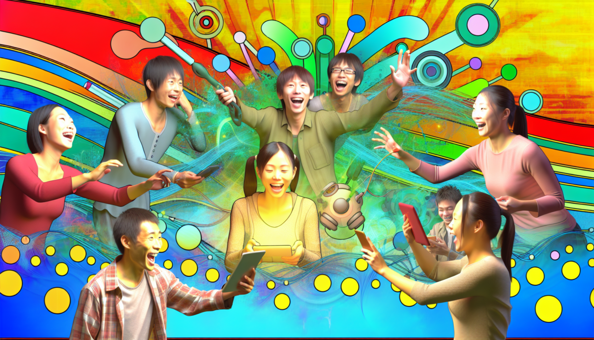 A vibrant scene depicting a group of young Japanese individuals engaged in dynamic interactions, with various digital devices in hand, expressing excitement and enthusiasm. The setting is bright and cheerful, showcasing the essence of two-way communication and responding to followers, with a backdrop of colorful banners or social media elements.