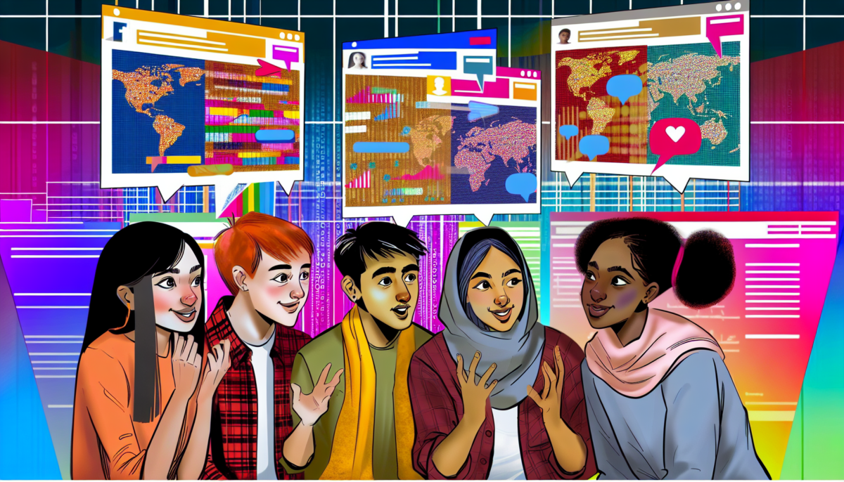 A vibrant illustration depicting a group of young Japanese individuals engaged in discussions about social media algorithms, with digital screens showing colorful feeds and data visualizations in the background. The scene should be lively, capturing their curiosity and excitement as they explore the impact of algorithms on their online experiences.